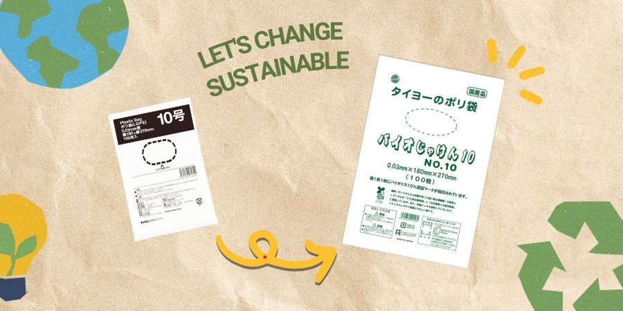 Portanto, como primeiro passo nessa transição, trocamos nossas sacolas plásticas frequentemente usadas, as nº 10 (tamanho pequeno) e nº 14 (tamanho médio), por sacolas certificadas como sacolas de biomassa!