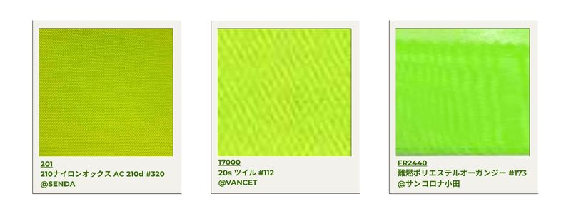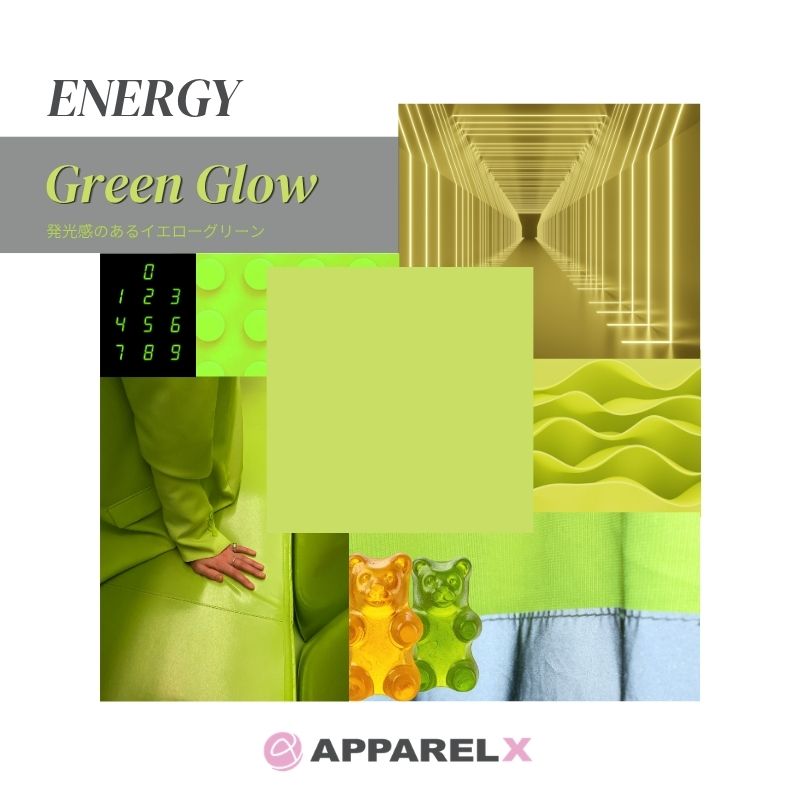 Com as tendências Y2K e Heisei em pleno vigor, este verde-amarelado possui uma qualidade luminosa que lembra a luz neon ou fosforescente. Sua vivacidade é realçada quando combinada com materiais leves como náilon e tafetá, ou com tecidos brilhantes. Quando combinado com tons escuros e simples, pode se tornar uma cor de destaque marcante para um estilo outono/inverno mais discreto.