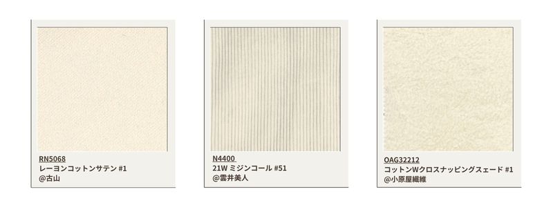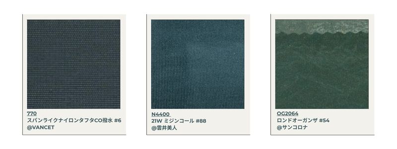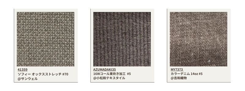 Diz-se que este material é difícil de fabricar no Japão, pois é usado para jeans leves. Três variações de cor são obtidas através de um controle cuidadoso da concentração do corante.