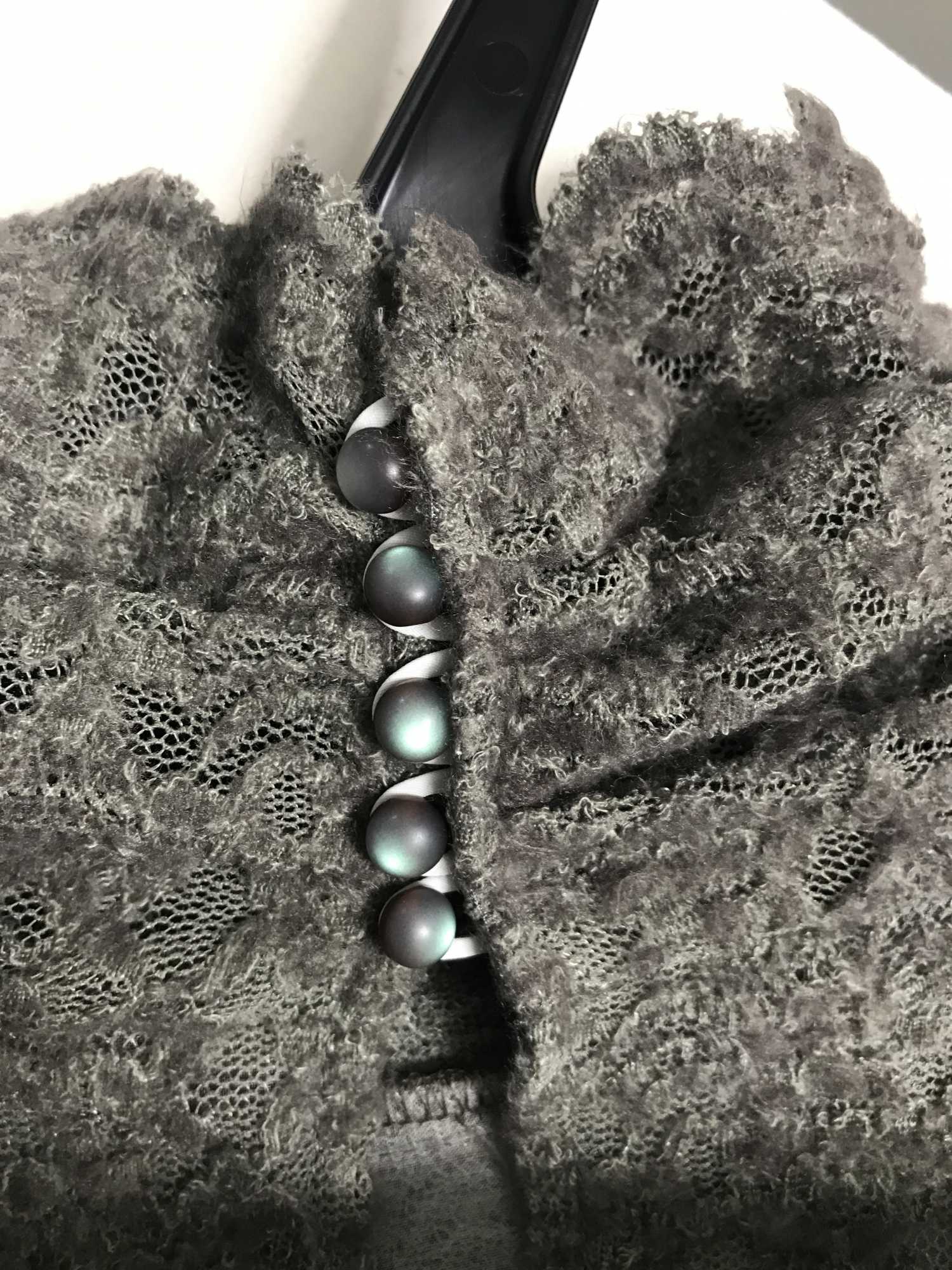 É um botão redondo em forma de bola. Lindamente feito que a cor muda dependendo do ângulo e do grau de luz.