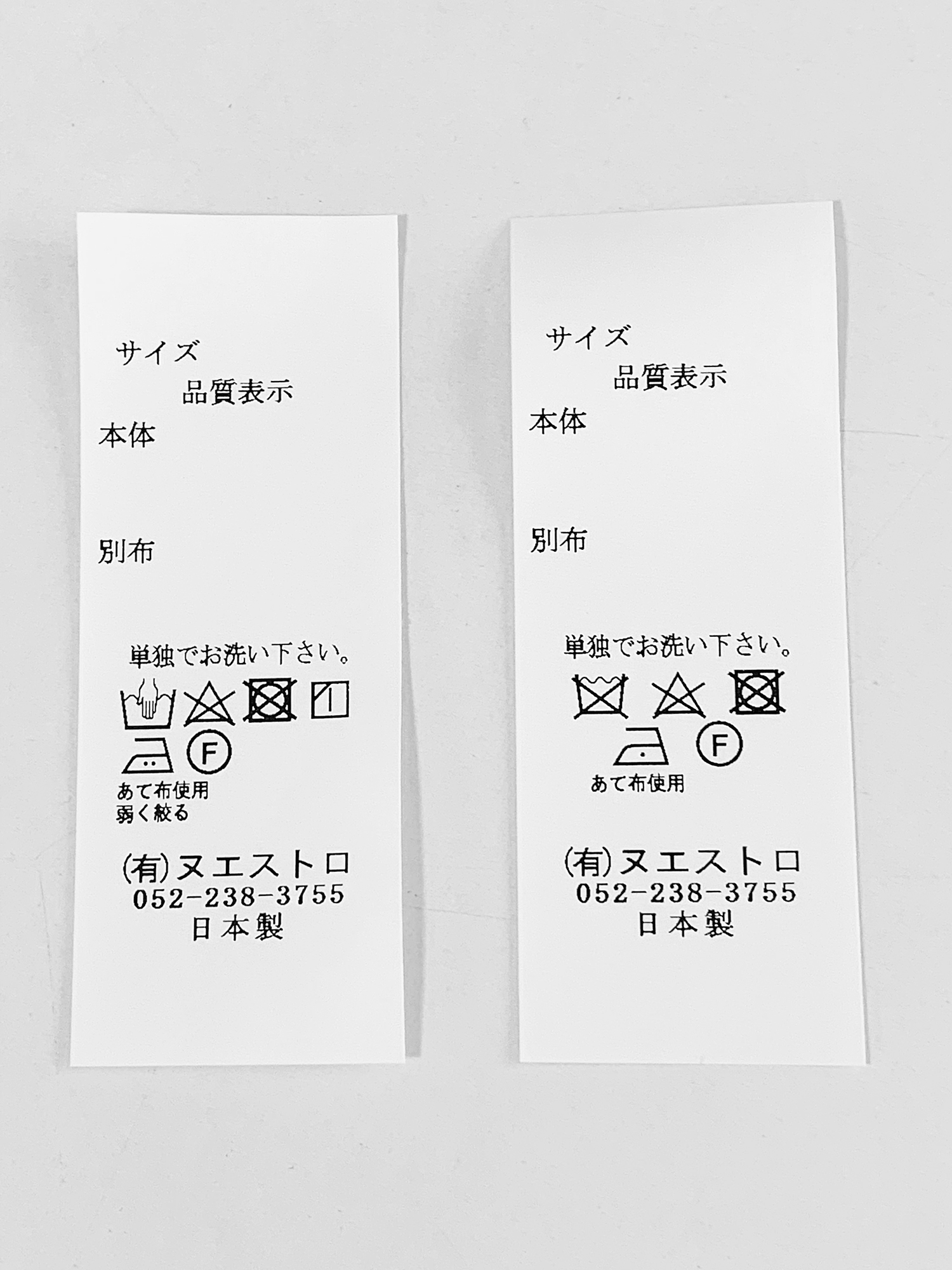 1. Composição da fibra (indicar o nome da fibra e a proporção de mistura) 2. Método de manuseio para lavagem doméstica, etc. (Indicar de acordo com as disposições de 4.1 e 4.3 do JIS L0217 usando pictogramas para manuseio.) 3. Nota complementar do nome da pessoa que exibiu (Adicionar o "nome ou nome" e "endereço ou telefone" da pessoa que exibiu)